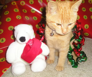 Now, I must admit to having a slight bias against orange-striped cats. I had a bad experience years ago, when Bandit was sick, dying. And this big orange-striped tom cat decided to muscle into Bandit’s turf while he was unable to properly defend it. I know that Big Orange was just doing what boy cats do. But Bandit had staked out his place first, and it wasn’t a fair contest with Bandit sick. So I went to Bandit’s defense, using a Super Soaker to chase off Big Orange whenever he came into my yard. I never wanted to hurt Big Orange, but I wanted my yard to be a safe refuge for Bandit. After Bandit died, I put the Super Soaker away and made my peace with Big Orange. He remembered my chasing him out, and was always a little leery of me. But in the end, Big Orange came to me when he was dying. So I guess he forgave me, or at least he knew that I would do my best for him in his hour of need. He was already dead when I found him, curled up in the middle of the big planter in the back yard. I buried him there, with full honors. So, I try to get over it, but I’m not particularly fond of orange-striped cats. I told myself that my personal feelings didn’t matter – what had been done to this kitten was just plain wrong.