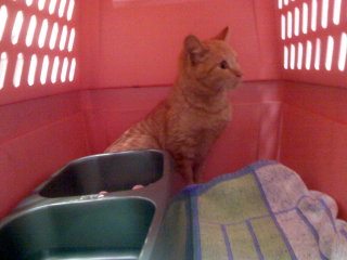 The little guy set up in the cat carrier, waiting for the work day to be over so he can go home with Dean.